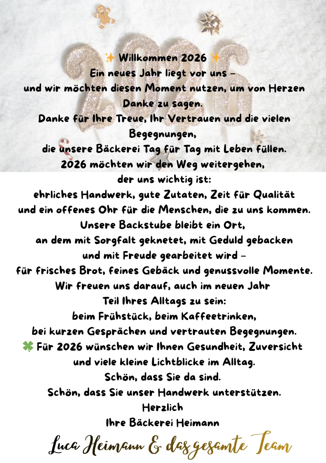 Mit dem Jahreswechsel 2025 beginnt ein neues Kapitel für unsere Bäckerei: Luca Heimann übernimmt die Leitung und führt damit das Lebenswerk seines Vaters in eine neue Generation....